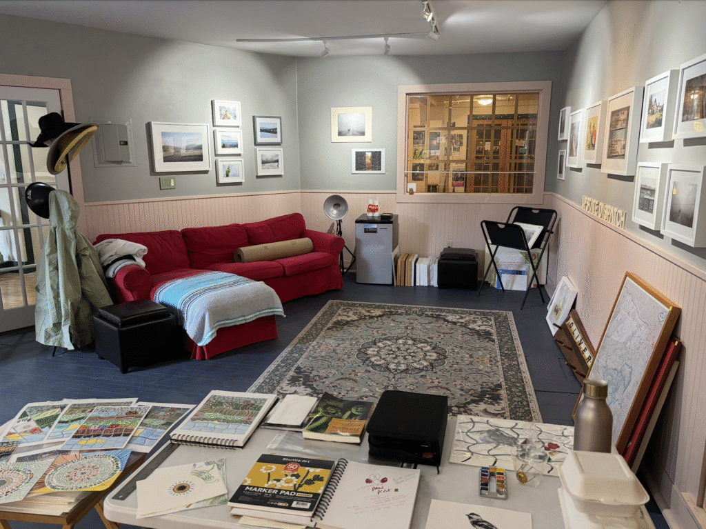 Last year Upstate Dispatch moved to a shopfront on Main Street in Margaretville that is part studio and part gallery. It hosted a winter group show of local artists over the 2025 Holiday Season and, throughout March 2026, it hosted two events for The Analog Project, kicking off with the Sunday Letter Writing sessions in which participants were invited to get off their phone and write actual letters to their friends and loved ones. Every Wednesday in March, Upstate Dispatch hosted a writer’s room where writers were welcome to drop in for some tea, a desk, and a dash of inspiration from the new spring show on the walls.